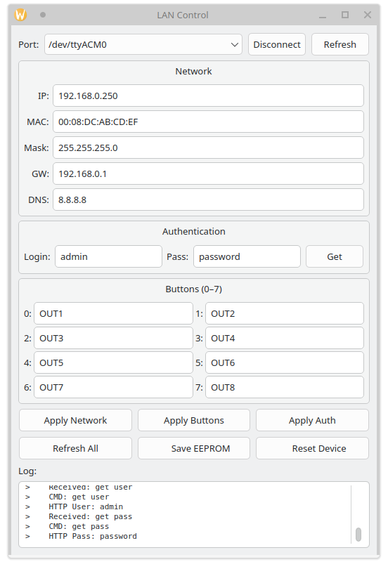 Для конфигурации сетевых настроек, пароля для доступа к веб интерфейсу и надписей на кнопках, было написано простое оконное приложение на Python (спасибо DeepSeek).