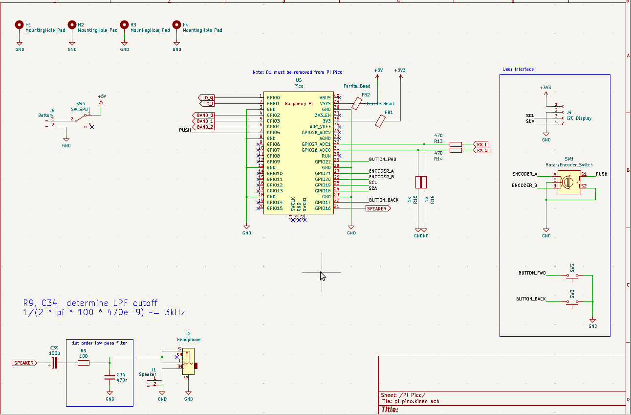Схема приемника максимально простая. За формирования опорного сигнала, выдачу звука, управление и связь c компьютером отвечает микроконтроллер RP2040. Естественно, и вся «математика» по демодуляции происходит в нем.