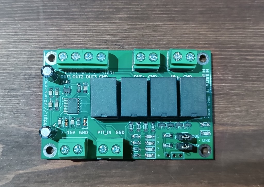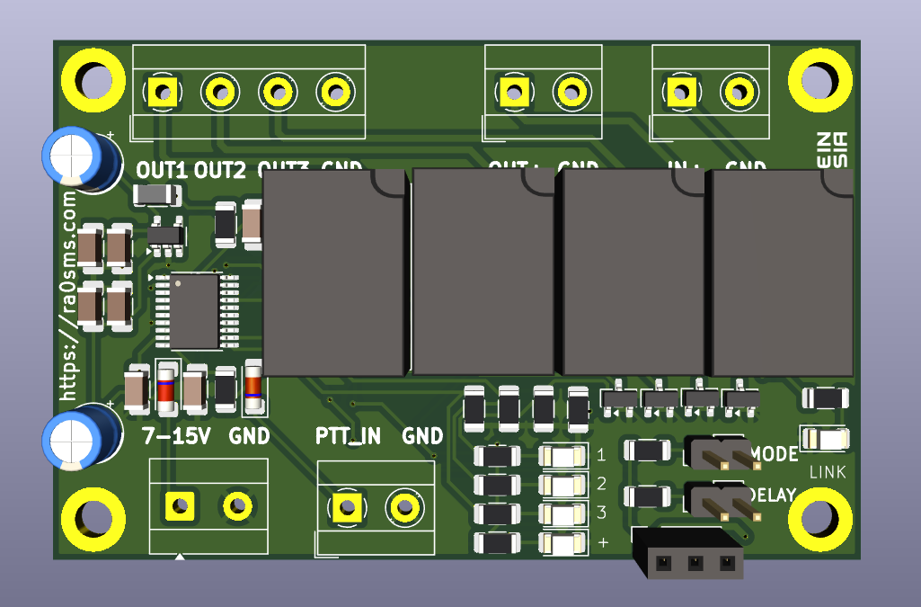 Габариты платы такие же — 70*45мм. Единственное, что изменилось — это напряжение питание и потребляемый ток. Применены реле на 12В, поэтому питание на плату должно быть в пределах 12-14В. Потребляемый ток — 100 мА (при 4 активных реле).