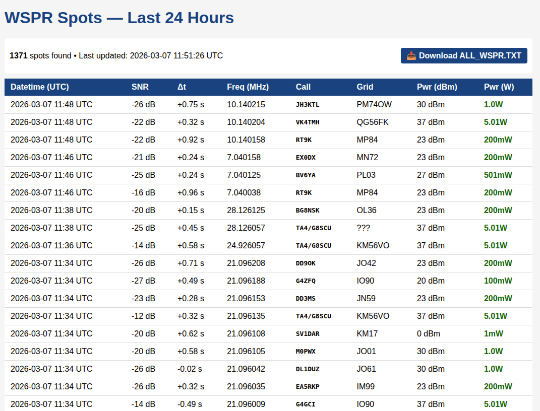 Таким образом получилось реализовать автоматическую смену диапазонов по графику WSJT (каждые 2 минуты). Споты можно посмотреть на различных ресурсах, которые обрабатывают данные с wsprnet.org. Например, на wspr.rocks. Это удобно и красиво, но все равно хотелось бы иметь возможность посмотреть на то, что принял твой приемник, не заходя каждый раз в консоль одноплатного компьютера. Поэтому я добавил простой web-интерфейс, который отображает споты за последние 24 часа и позволяет скачать весь файл ALL_WSPR.TXT для более глубокого анализа.